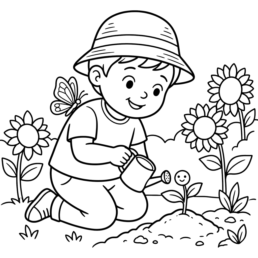 En glad gutt med hatt kneler for å vanne en liten spire med et smilende ansikt, omgitt av blomstrende solsikker og en sommerfugl som hviler på skulderen hans. Denne gledelige scenen fanger essensen av et barn som steller en levende hage.