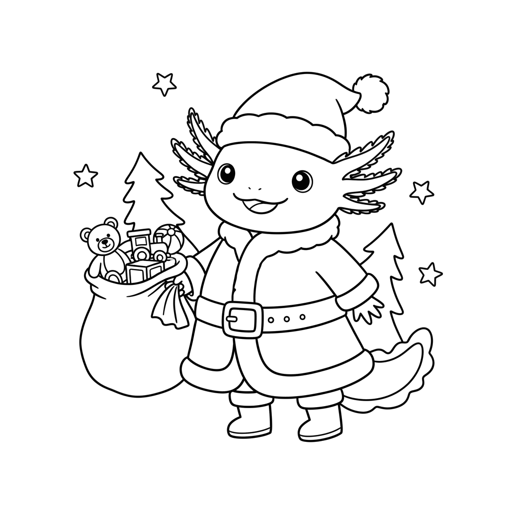 En glad axolotl kledd som julenissen holder en sekk full av juleleker, klar til å spre julestemning. Denne bedårende skapningen er omgitt av festlige stjerner og grantrær, perfekt for en koselig vinteraktivitet.