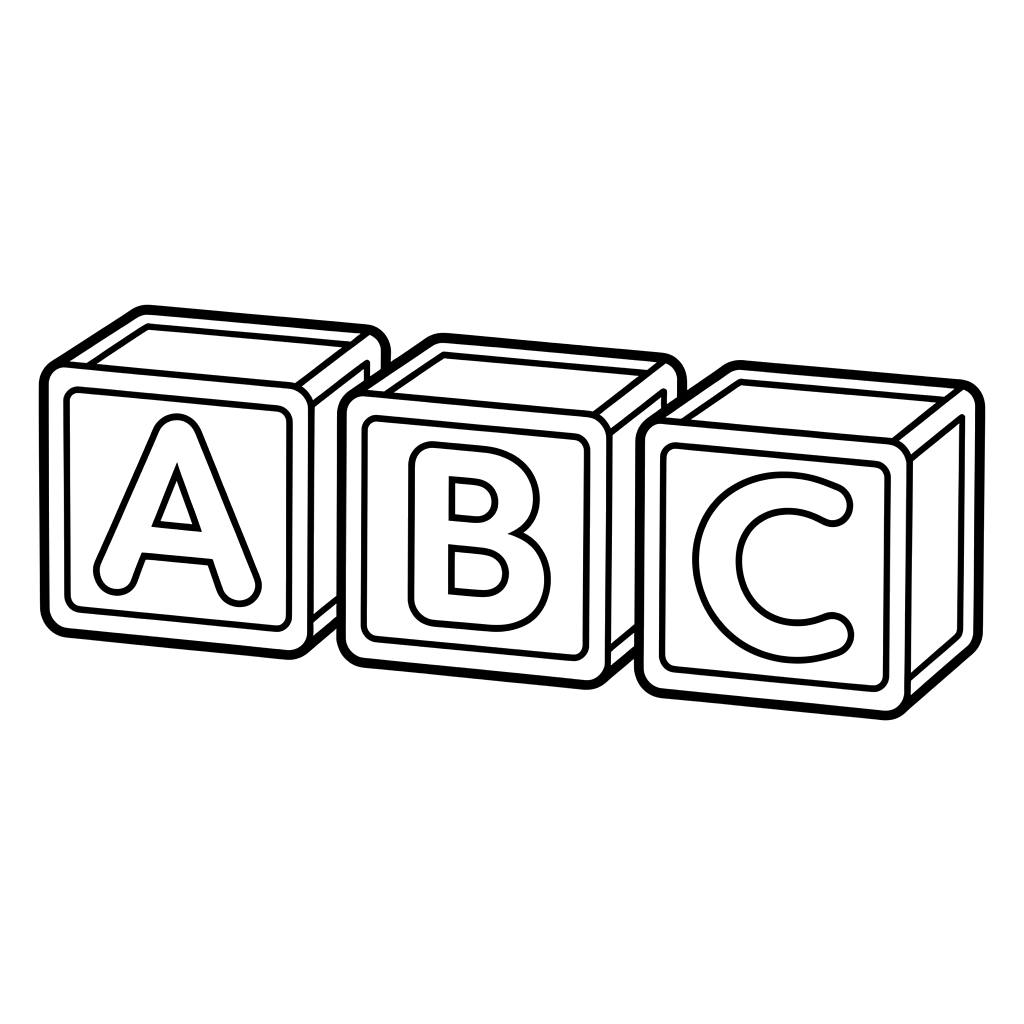 Tre klassiske alfabetklosser staver 'ABC' og inviterer barn til å fargelegge og lære sine første bokstaver i en morsom, lærerik aktivitet.