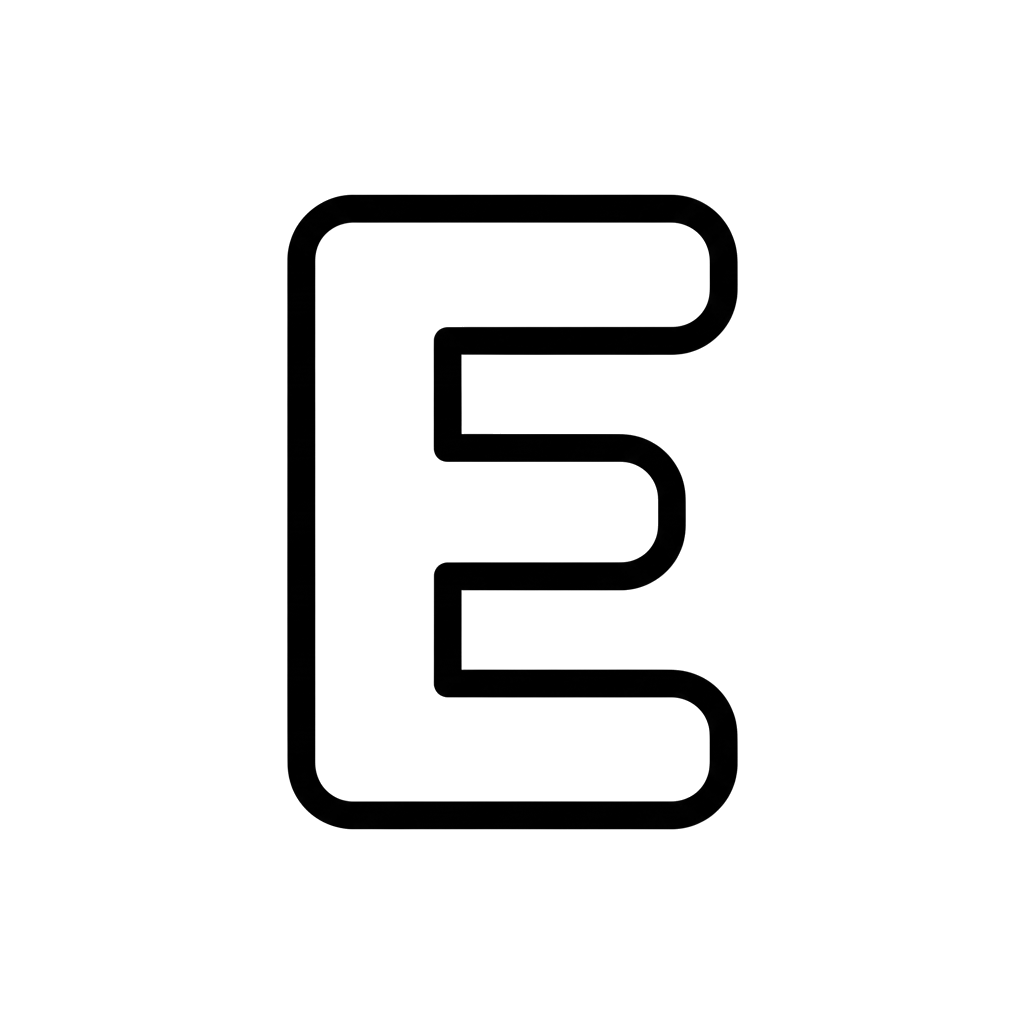 Dette enkle og tydelige bildet viser en stor stor bokstav 'E' i en tykk, avrundet svart linjekunststil, perfekt for små elever å fargelegge og gjenkjenne bokstaver.