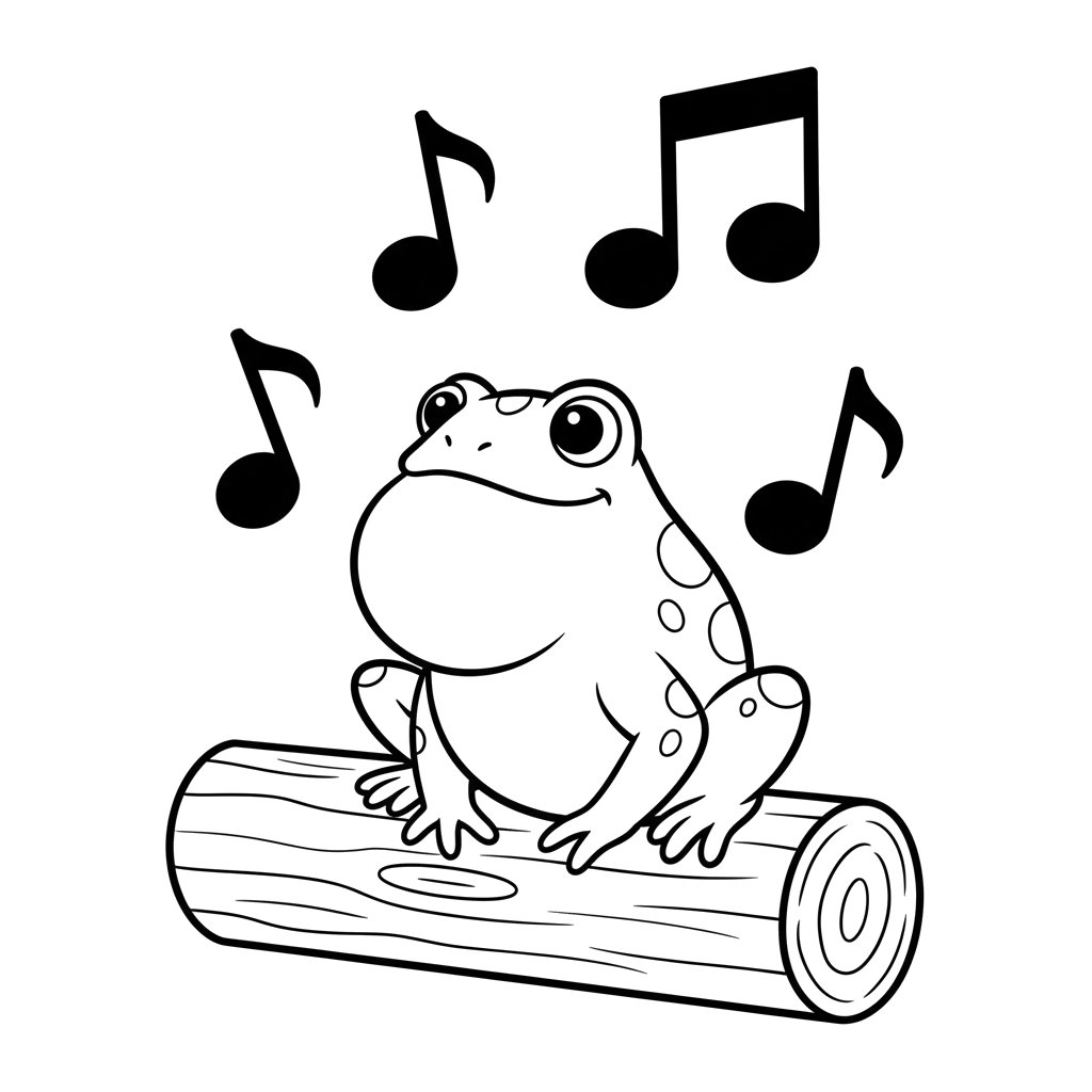 En glad frosk med store øyne sitter komfortabelt på en trestubbe, omgitt av noter, noe som antyder at den kvakker en melodi.