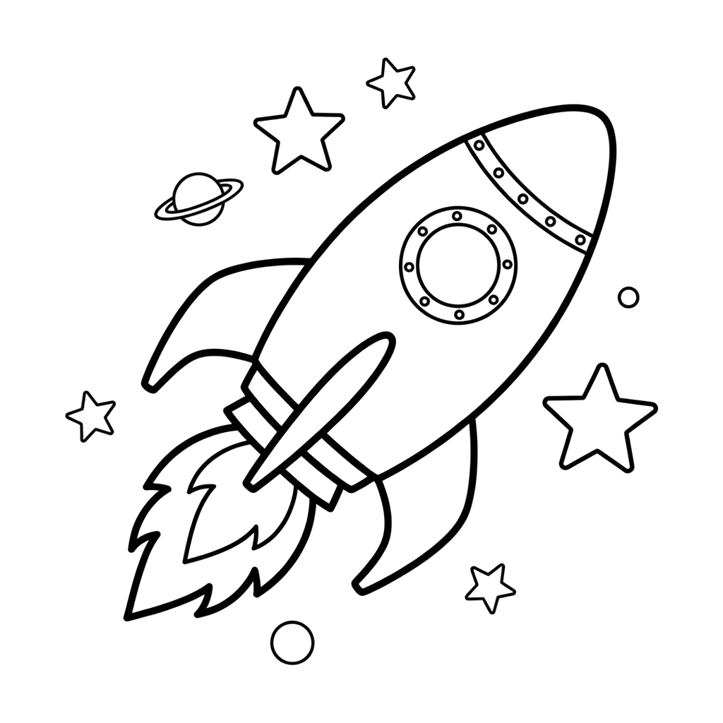 En dristig rakett svever gjennom kosmos, etterlater et flammende spor bak seg, omgitt av glitrende stjerner og en ringplanet. Dette bildet inviterer unge utforskere til å forestille seg en spennende reise bortenfor jorden.