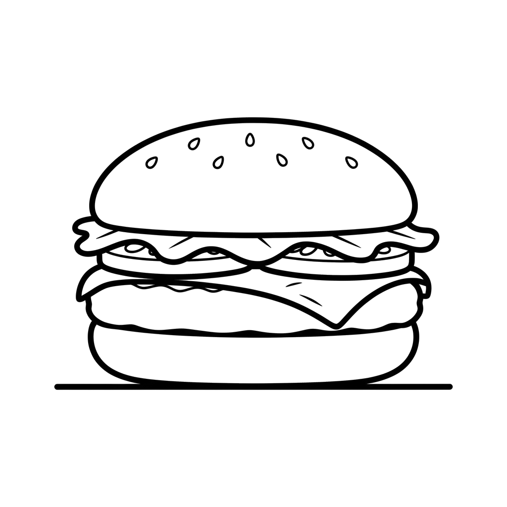 En fristende hamburger, komplett med sesambrød, kjøtt, ost og salat, er perfekt skissert for en morsom fargeleggingsaktivitet.