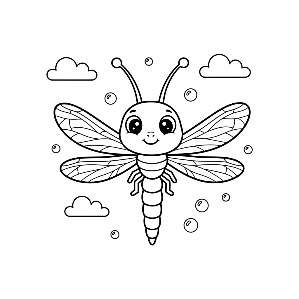 Denne bedårende kawaii-øyenstikkeren med store, glade øyne og et søtt smil er klar for et fargespill. Den svever lykkelig blant skyer og lekne bobler.