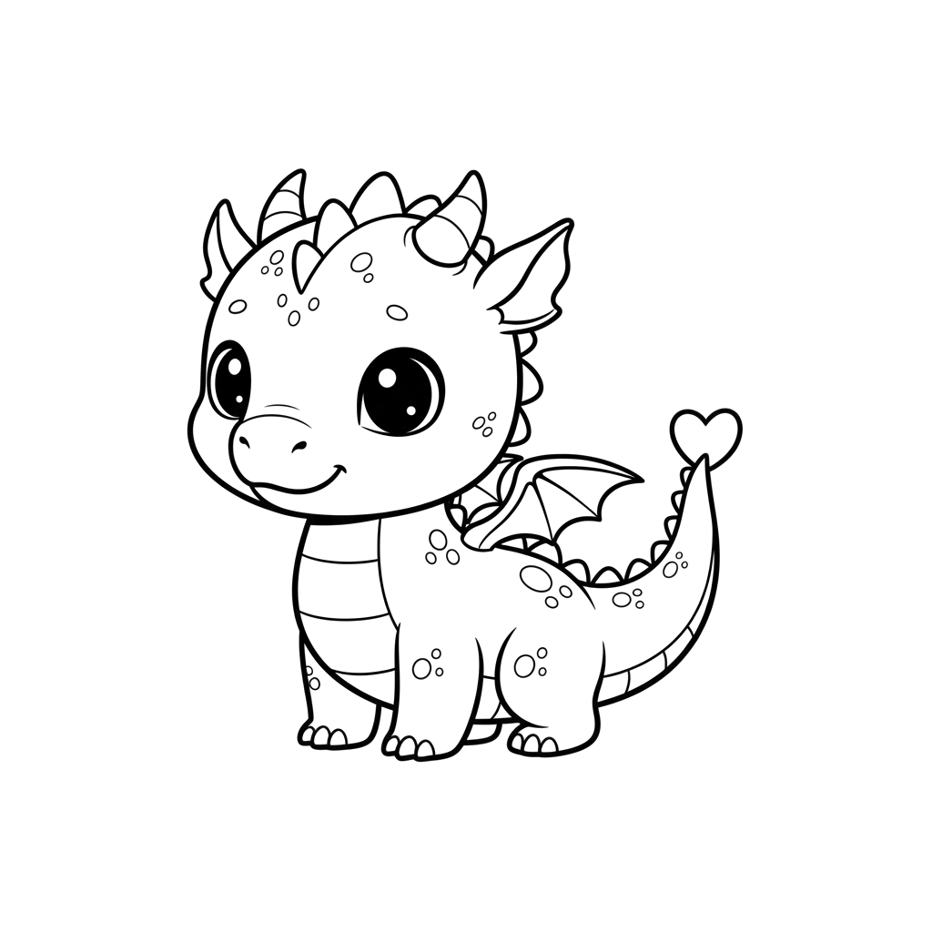 Een charmante babydraak staat met grote, vriendelijke ogen en een zachte glimlach, zijn staart eindigend in een schattige hartvorm. Dit schattige wezentje is perfect om tot leven te brengen met levendige kleuren.