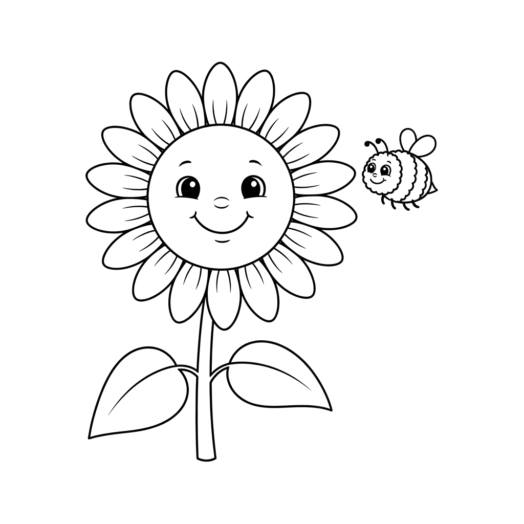 Een blije zonnebloem met een vriendelijk gezicht staat trots terwijl een schattig bijtje in de buurt zoemt. Deze heerlijke scène is perfect voor jonge kunstenaars om met kleur tot leven te brengen.