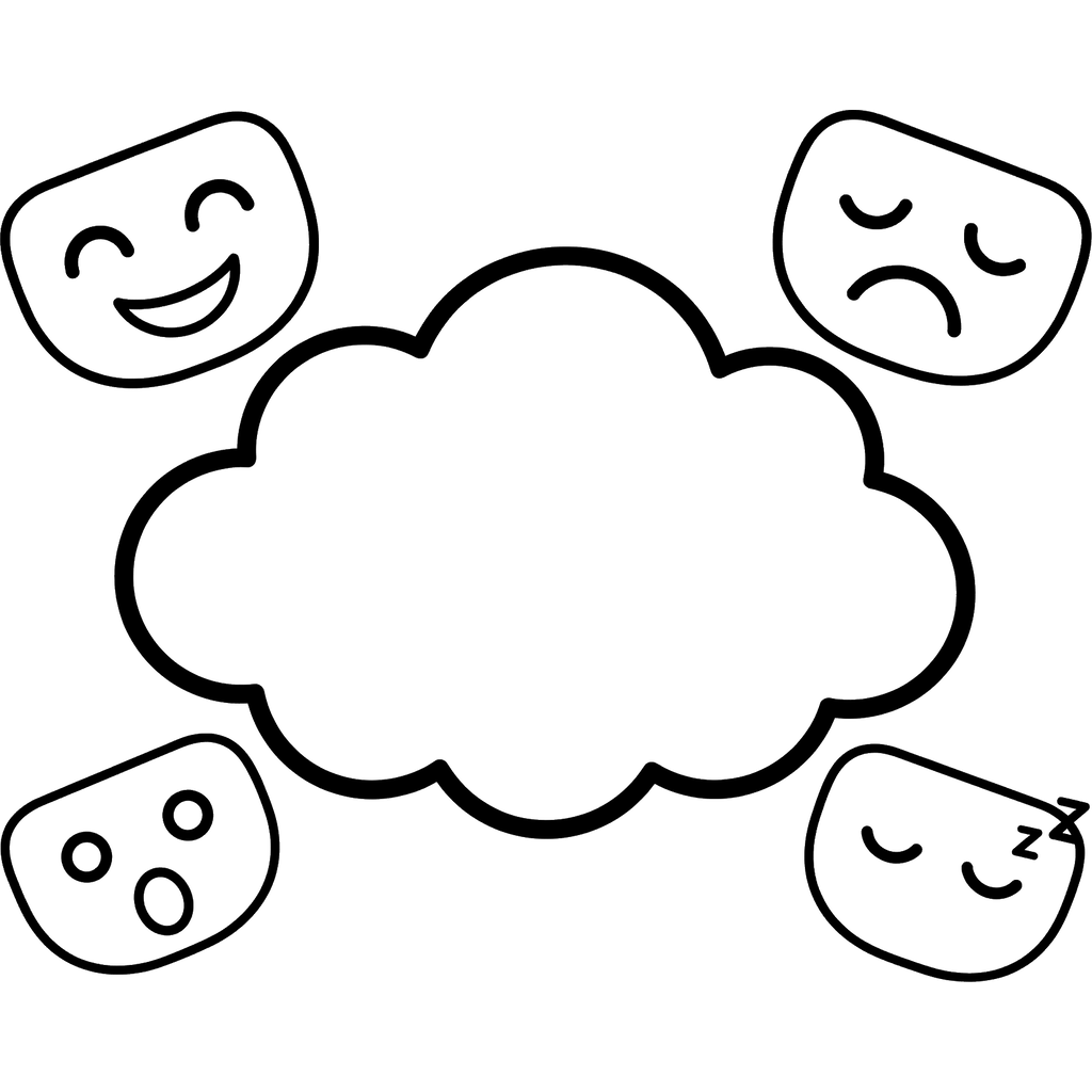 Een creatieve opstelling toont een grote, pluizige wolk in het midden, omringd door vier expressieve emoji-gezichtjes, elk met een andere stemming. Deze eenvoudige doch boeiende compositie nodigt uit tot het verkennen van emoties zoals vreugde, verdriet, verrassing en rust.
