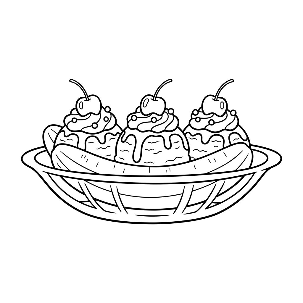 Een heerlijk bananensplit-dessert met drie royale bollen ijs, elk getopt met luchtige slagroom, rijke siroop en een kers, allemaal geserveerd in een klassieke bootvormige schaal.