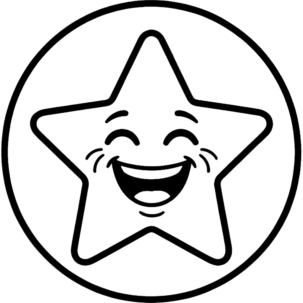 Een vrolijk sterrenfiguurtje met een wijd open, lachende mond en dichtgeknepen ogen, dat pure vreugde uitstraalt vanuit een cirkelvormig kader. Deze blije ster is perfect om ieders dag op te vrolijken.