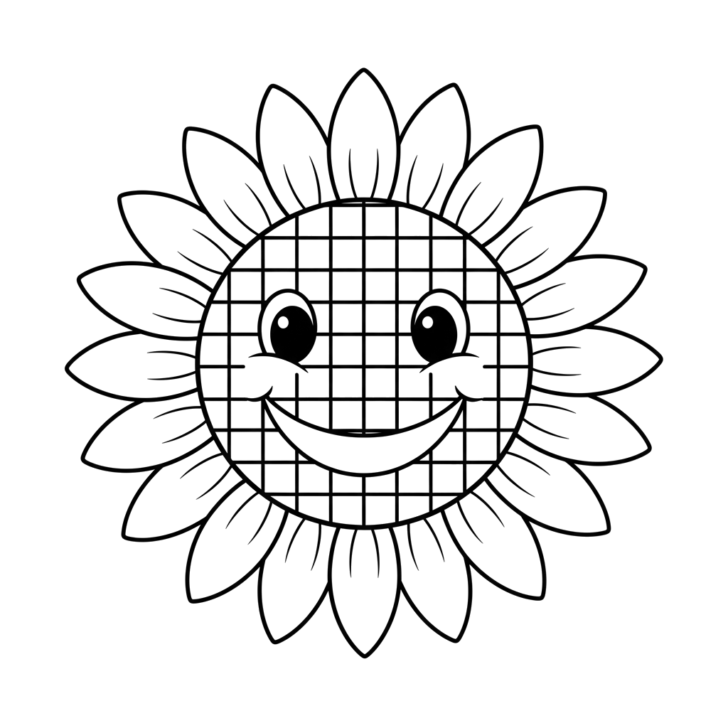 Een vrolijke zonnebloem met een lachend gezicht, voorzien van een uniek rasterpatroon in het midden, klaar voor een kleurrijke aanvulling.