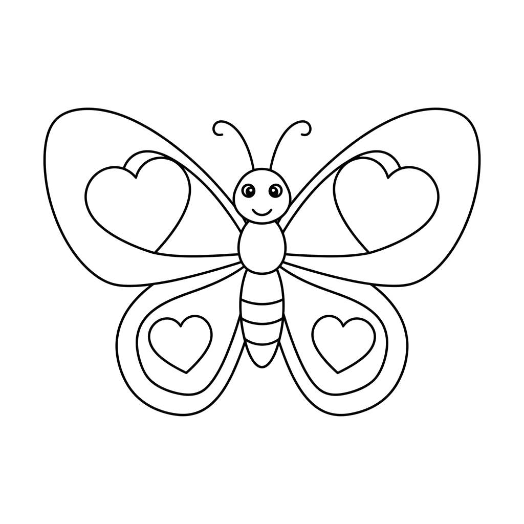 Een vriendelijke vlinder met een lachend gezicht en charmante hartpatronen op zijn vleugels, perfect voor creatief kleuren. Dit vrolijke insectenontwerp nodigt uit tot fantasie en kleur.