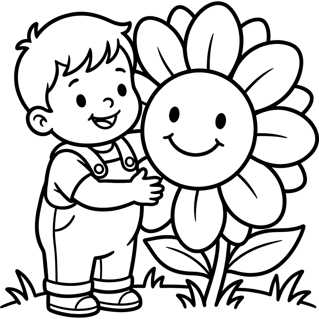 Een vrolijk jongetje in een tuinbroek omhelst blij een gigantische, lachende zonnebloem in een zonnig veld. Deze hartverwarmende scène legt een moment van vriendschap vast tussen een kind en de natuur.