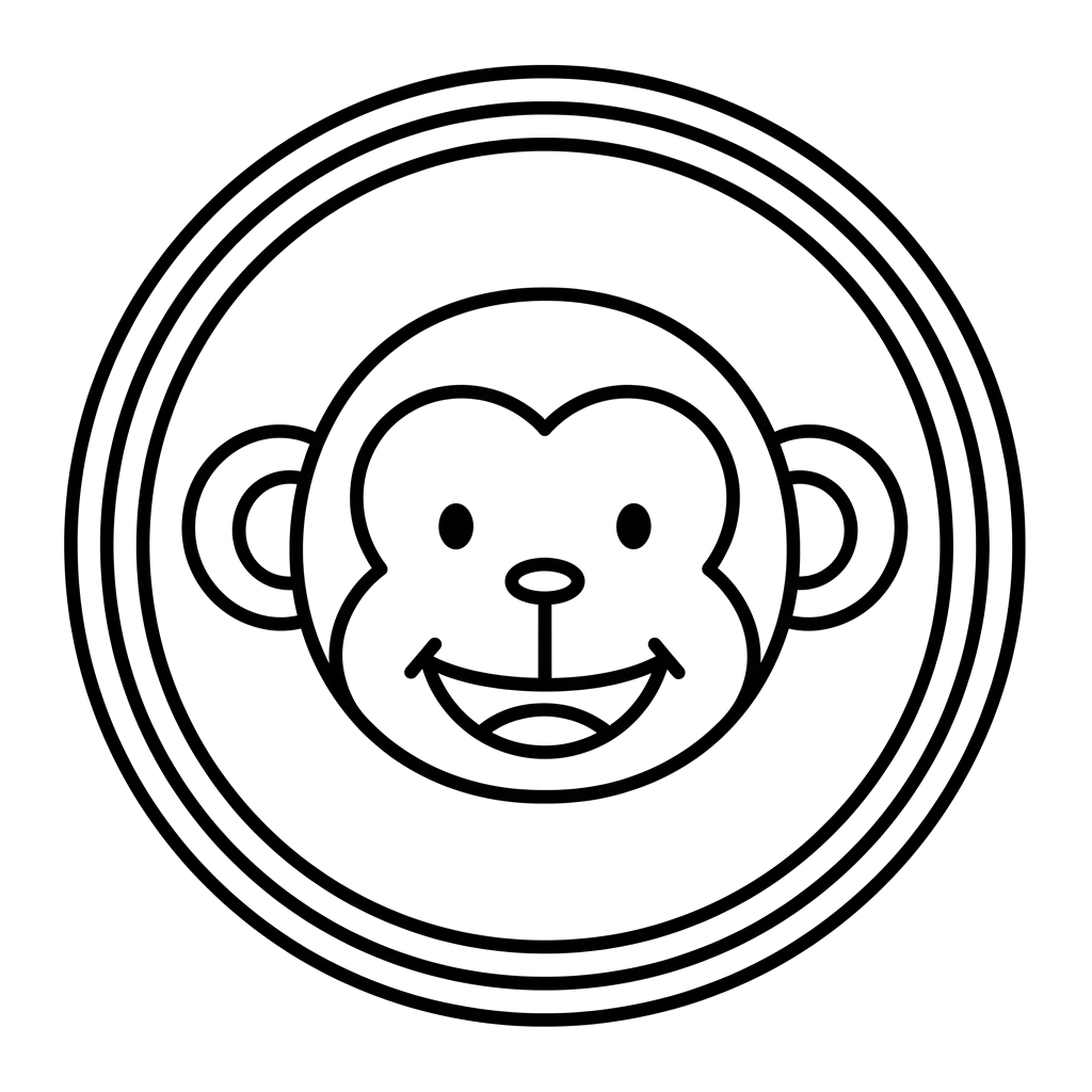 Een vrolijk apengezicht met een brede glimlach wordt prominent weergegeven binnen een vetgedrukte, drievoudig omrande cirkelvormige rand. Deze eenvoudige afbeelding vangt de vreugdevolle geest van een geliefde primaat.