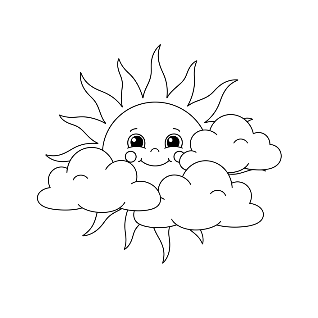 Een vrolijke tekenfilmzon met een vriendelijk gezicht straalt achter pluizige wolken vandaan, helemaal klaar voor een vrolijk kleurtje. Deze schattige scène vangt een blije dag, perfect voor jonge artiesten.