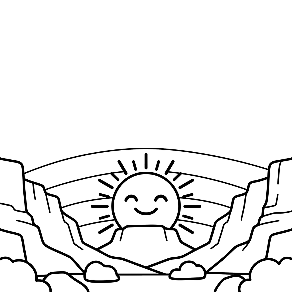 Een prachtige scène ontvouwt zich met een lachende zon die majestueus opkomt tussen torenhoge bergen, bekroond door een schitterende regenboog. Donzige wolken sieren het landschap en dragen bij aan de serene buitenomgeving.
