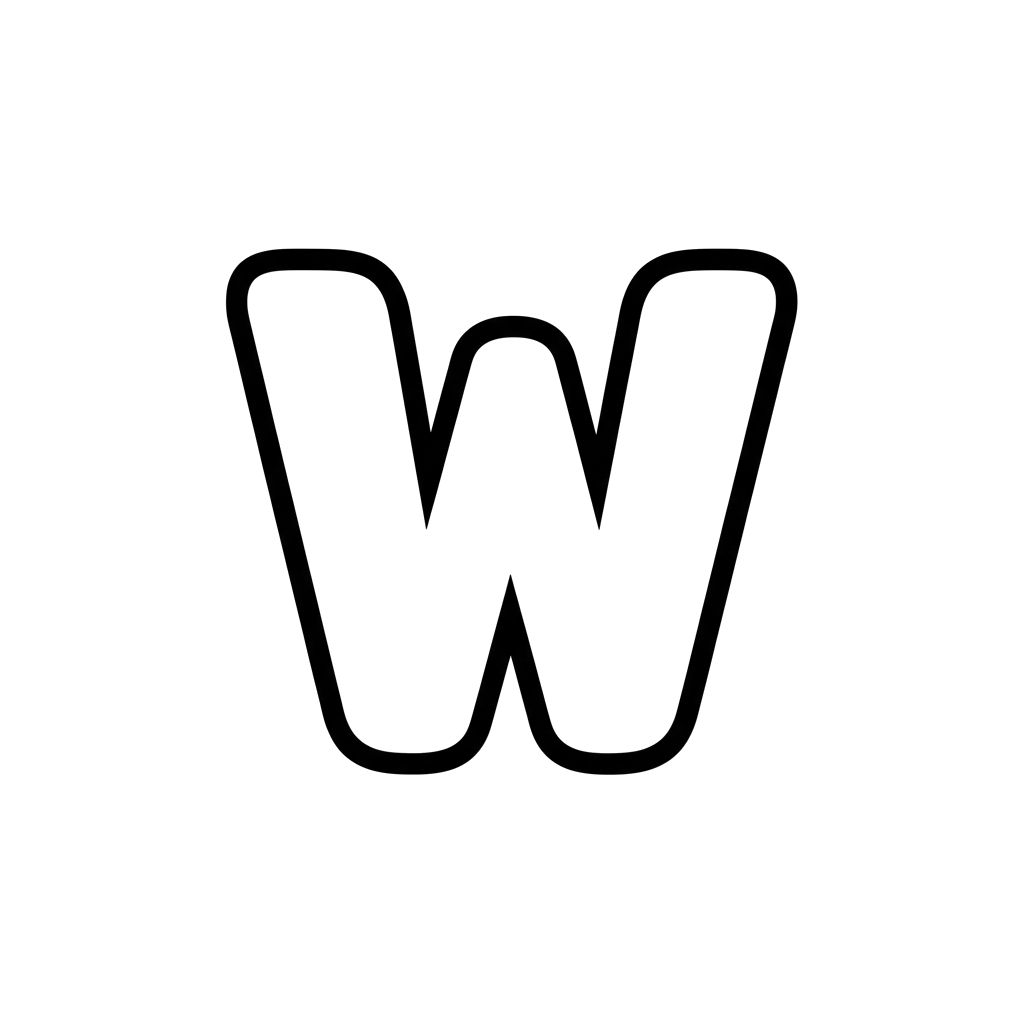 Ten obraz przedstawia wyraźne, pogrubione czarne wykonanie małej litery „w” w przyjaznej, zaokrąglonej czcionce, idealne do zajęć edukacyjnych lub personalizacji.