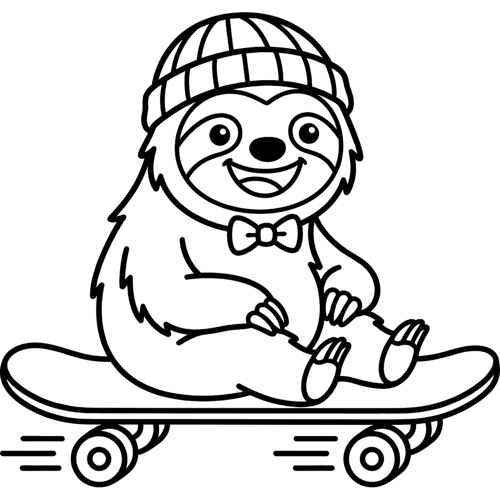Wesoły leniwiec w czapce i muszce uśmiecha się radośnie, jadąc na deskorolce. Ta urocza zwierzęca przygoda jest gotowa na zabawną sesję kolorowania.