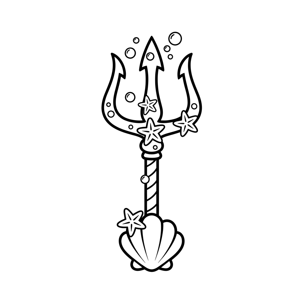 Urzekający rysunek trójzębu, ozdobionego rozgwiazdami, bąbelkami i muszlą u podstawy. Ten wodny wzór oddaje esencję czarującego podwodnego królestwa.