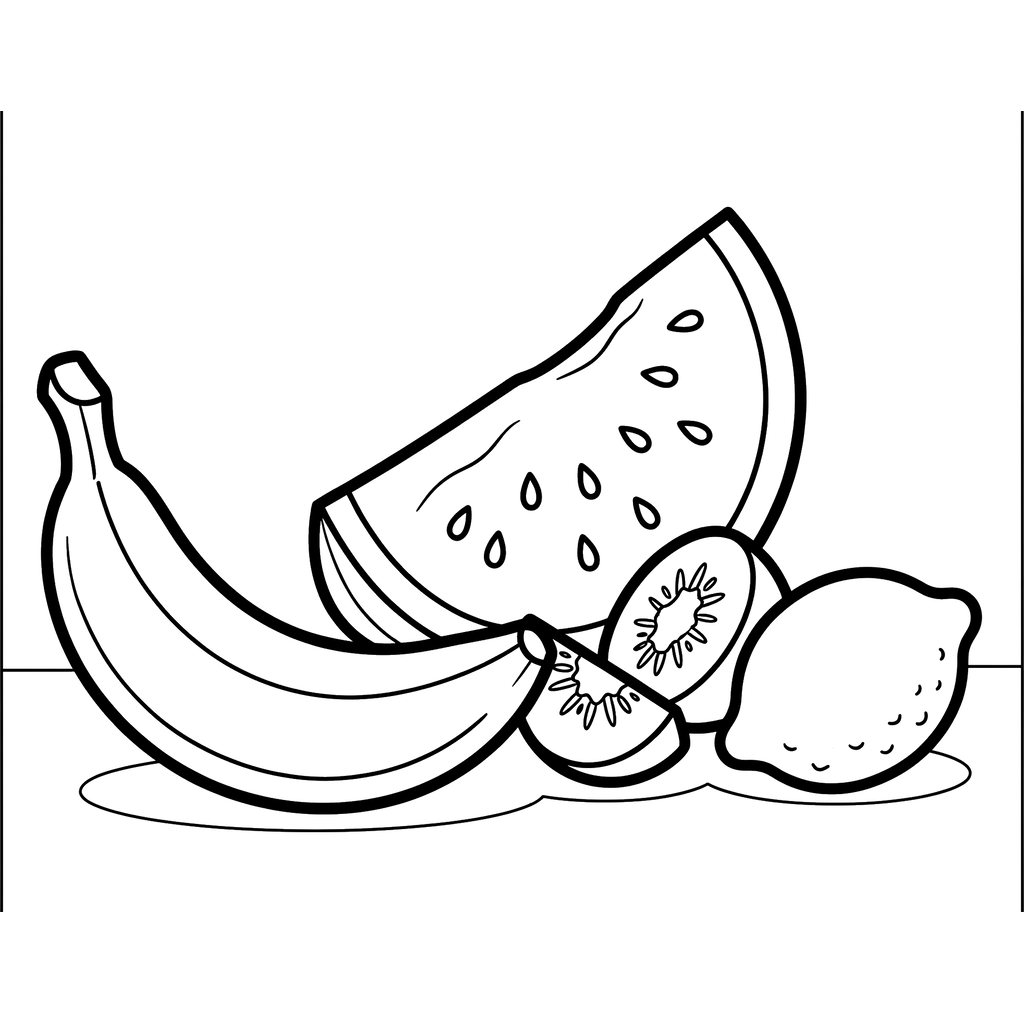 Urocza martwa natura przedstawia dojrzałego banana, kawałek soczystego arbuza, całą cytrynę i dwie połówki kiwi, gotowe do pokolorowania.