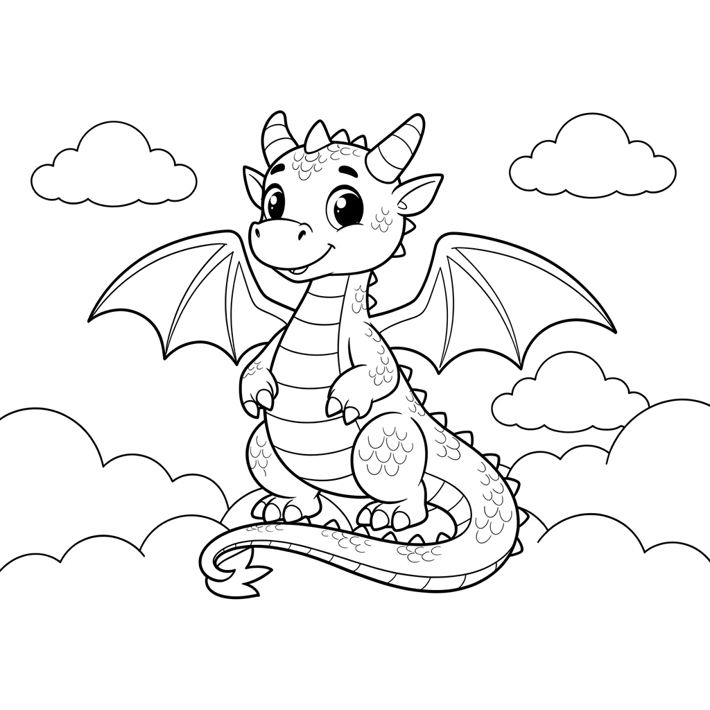 Uroczy smoczek z dużymi oczami i przyjaznym uśmiechem stoi dumnie na chmurze, z rozpostartymi skrzydłami. Ta urocza istota jest otoczona miękkimi, puszystymi chmurami, gotowa do kreatywnego kolorowania.