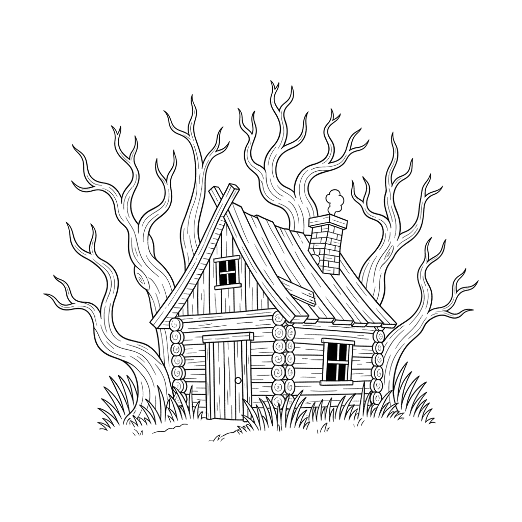 Rustykalna drewniana chata stoi na uboczu pośród skupiska sękatych, nagich drzew, nadając jej nieco tajemniczy lub upiorny wygląd, z trawą otaczającą jej podstawę.