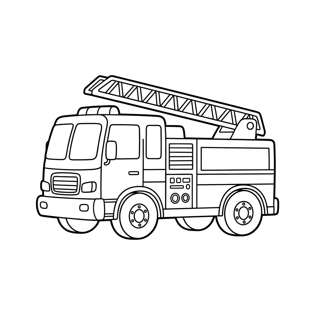 Ten obraz przedstawia szczegółową straż pożarną z dużą drabiną na górze, idealną do kolorowania dla przyszłych strażaków. Prezentuje klasyczny design pojazdu i jego niezbędne wyposażenie.