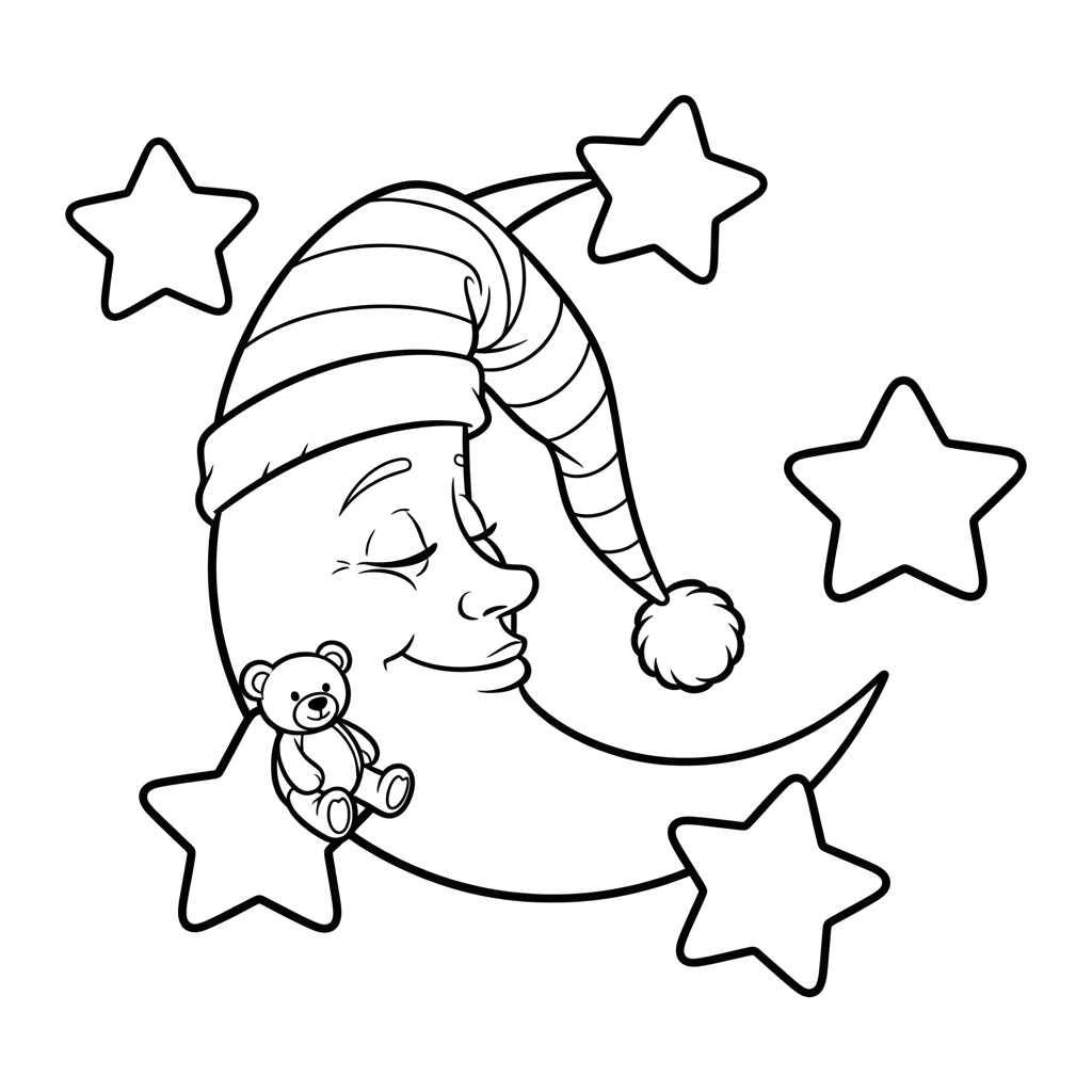 Uma lua crescente pacífica usando um gorro de dormir listrado é cercada por estrelas, com um doce ursinho de pelúcia descansando em uma delas. Esta cena encantadora evoca sentimentos de hora de dormir e doces sonhos.