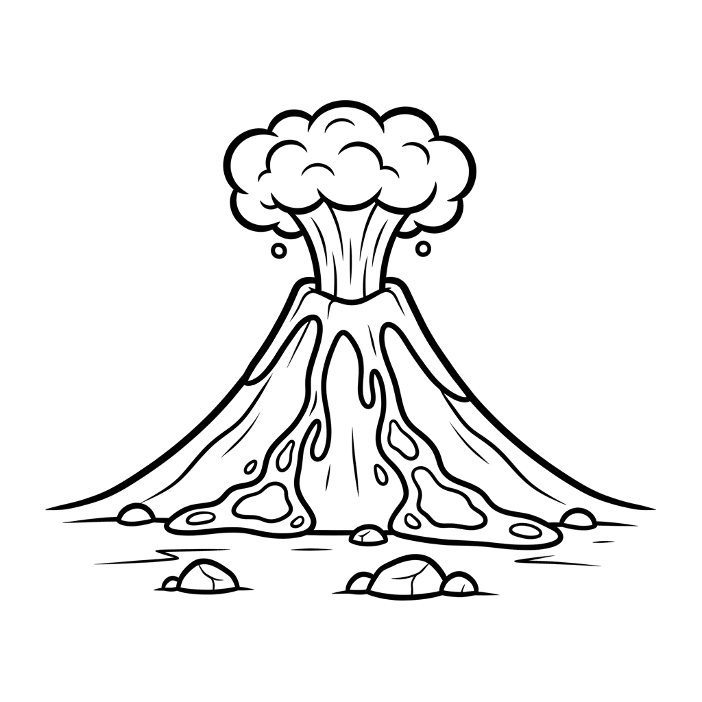 Um vulcão clássico estilo desenho animado entra em erupção, enviando uma grande coluna de fumaça para o céu enquanto a lava derretida flui dramaticamente por suas encostas rochosas, cercado por rochas espalhadas.