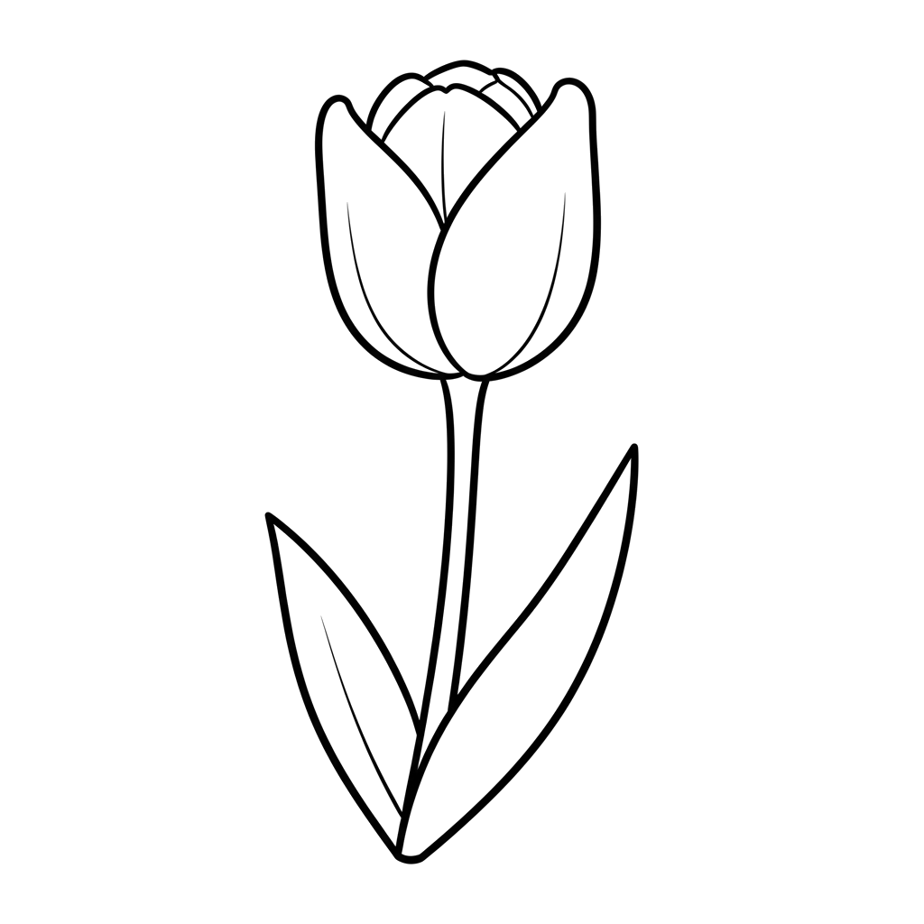 Esta página para colorir simples e elegante apresenta uma única tulipa com uma flor em botão e duas folhas distintas. É perfeita para quem aprecia temas botânicos e a beleza da primavera.