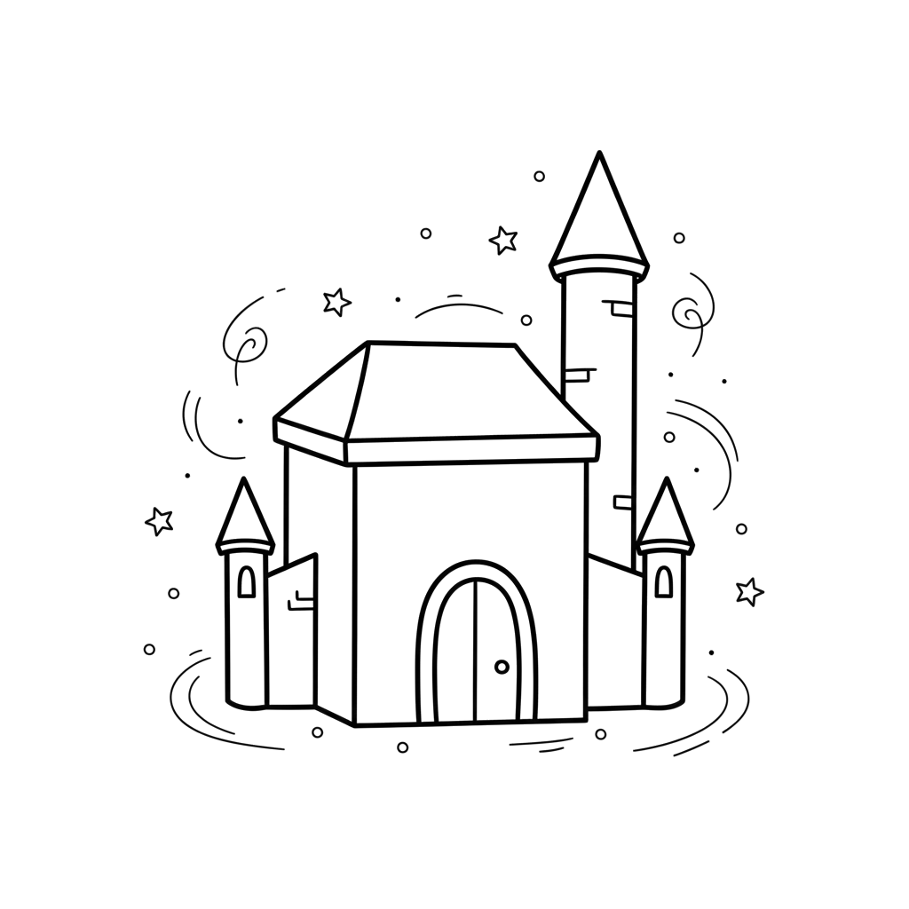 Um castelo encantador com múltiplas torres e uma grande entrada em arco, cercado por estrelas e espirais divertidas, evocando uma sensação de magia e admiração.