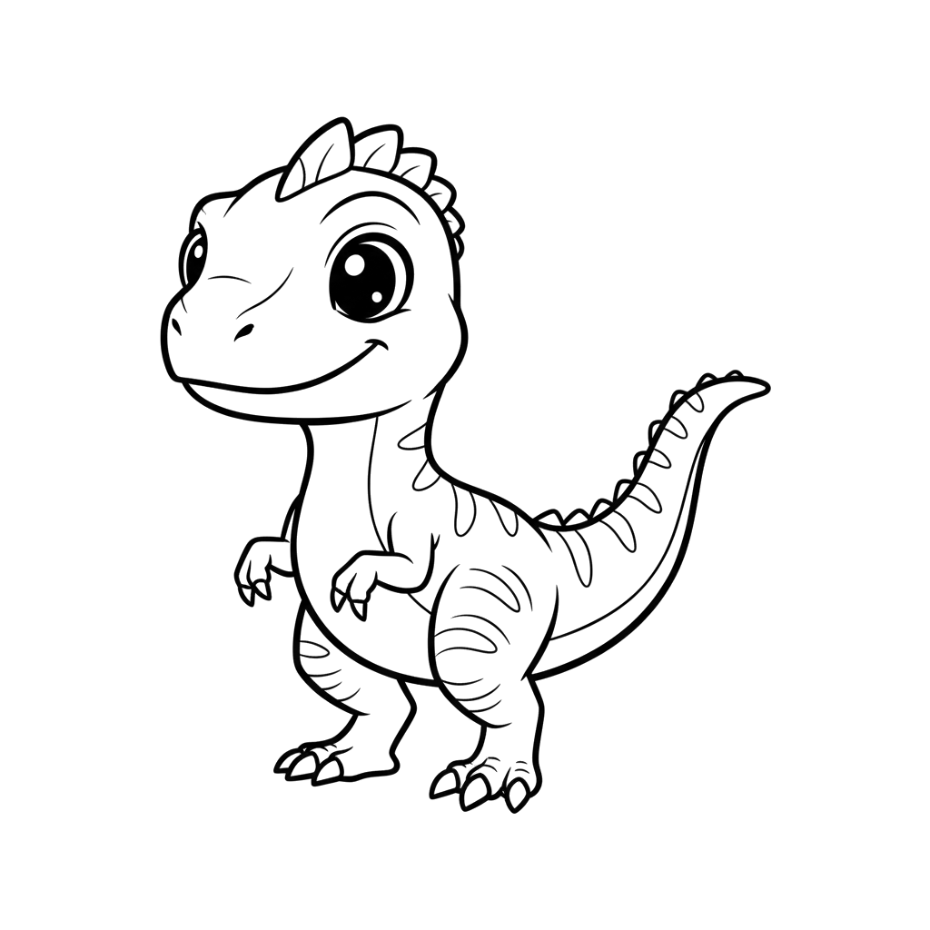 Um encantador dinossauro bebê com olhos grandes e brilhantes e um sorriso alegre, pronto para um toque de cor. Esta adorável criatura pré-histórica está de pé sobre as patas traseiras, olhando de forma convidativa para o espectador.