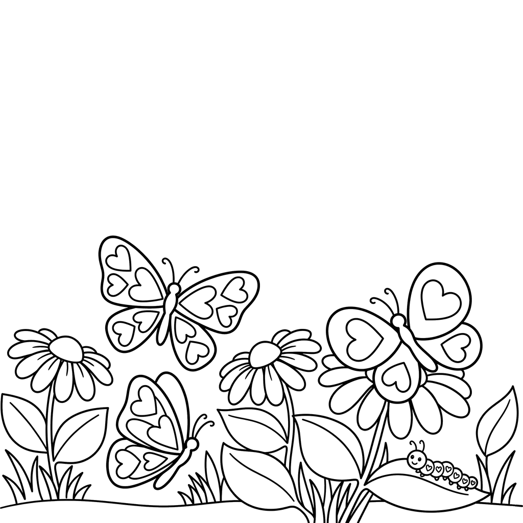 Três encantadoras borboletas com asas com padrão de corações esvoaçam entre um jardim vibrante de flores desabrochando e relva luxuriante, com uma pequena lagarta a repousar numa folha. Esta cena deliciosa oferece uma bela oportunidade para dar vida à beleza da natureza com cor.
