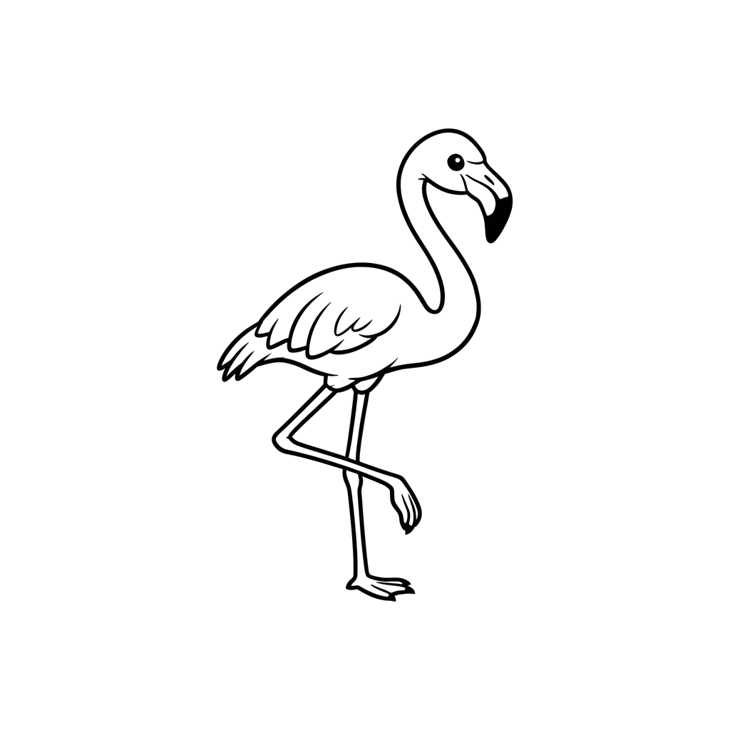 Um flamingo gracioso se equilibra em uma perna, sua forma elegante pronta para um toque de cor vibrante. Esta arte simples captura a postura icônica da ave.