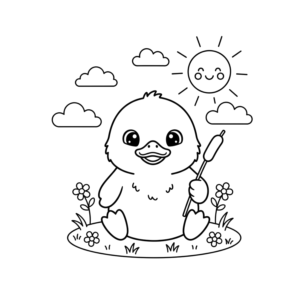 Um contorno encantador apresenta um patinho feliz sentado num campo gramado, segurando uma taboa, com um sol sorridente e nuvens fofas no céu. Esta cena adorável é perfeita para jovens artistas colorirem.