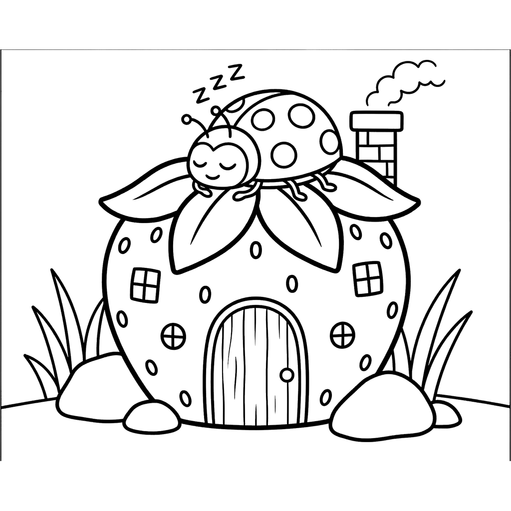 O buburuză drăguță este văzută dormind liniștită pe o căsuță rotundă și confortabilă, care seamănă cu o boabă, completă cu o ușă mică, ferestre și un coș de fum care scoate fum. Locuința fermecătoare este așezată printre iarbă și pietre într-un cadru senin.
