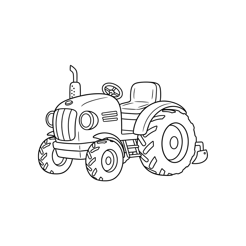 Această imagine simplă prezintă un tractor robust, cu roți mari și o țeavă de eșapament, perfect pentru un mic fermier care să-l coloreze. Este gata să muncească câmpurile și să aducă bucurie oricărei scene agricole.