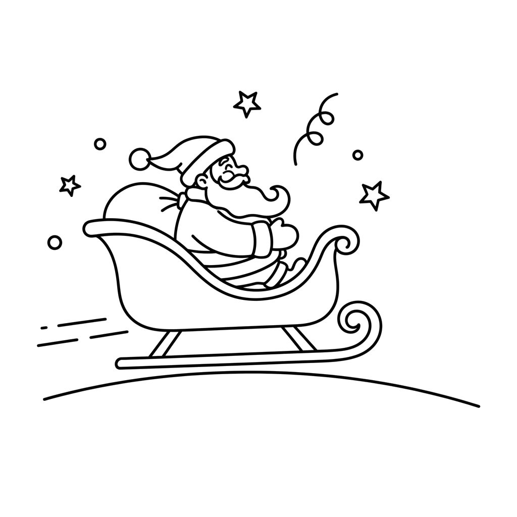 Un Moș Crăciun vesel este înfățișat plimbându-se în sania sa festivă, completă cu un sac plin de cadouri, sub un cer presărat cu stele și confetti. Această imagine încântătoare surprinde spiritul bucuriei și entuziasmului sărbătorilor.
