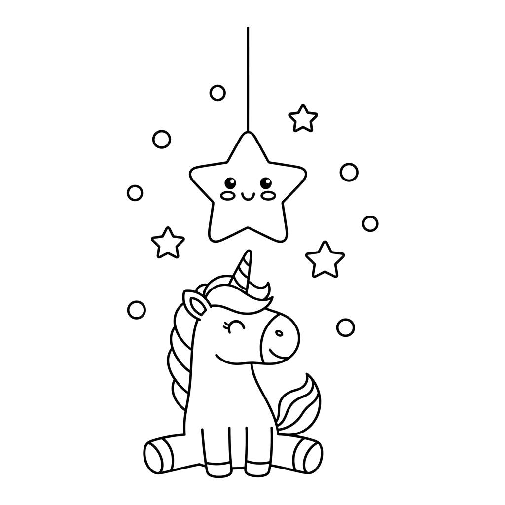 O scenă dulce și simplă, prezentând un unicorn vesel așezat, care privește o stea zâmbitoare suspendată. Câteva stele și cercuri mai mici plutesc în jur, creând o atmosferă magică.