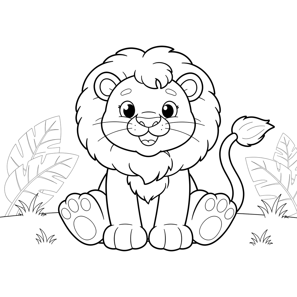 Un pui de leu fermecător cu o coamă pufoasă stă într-un peisaj de junglă, arătând vesel și gata să prindă viață cu culoare. Expresia prietenoasă a acestui pui adorabil îl face perfect pentru tinerii artiști.