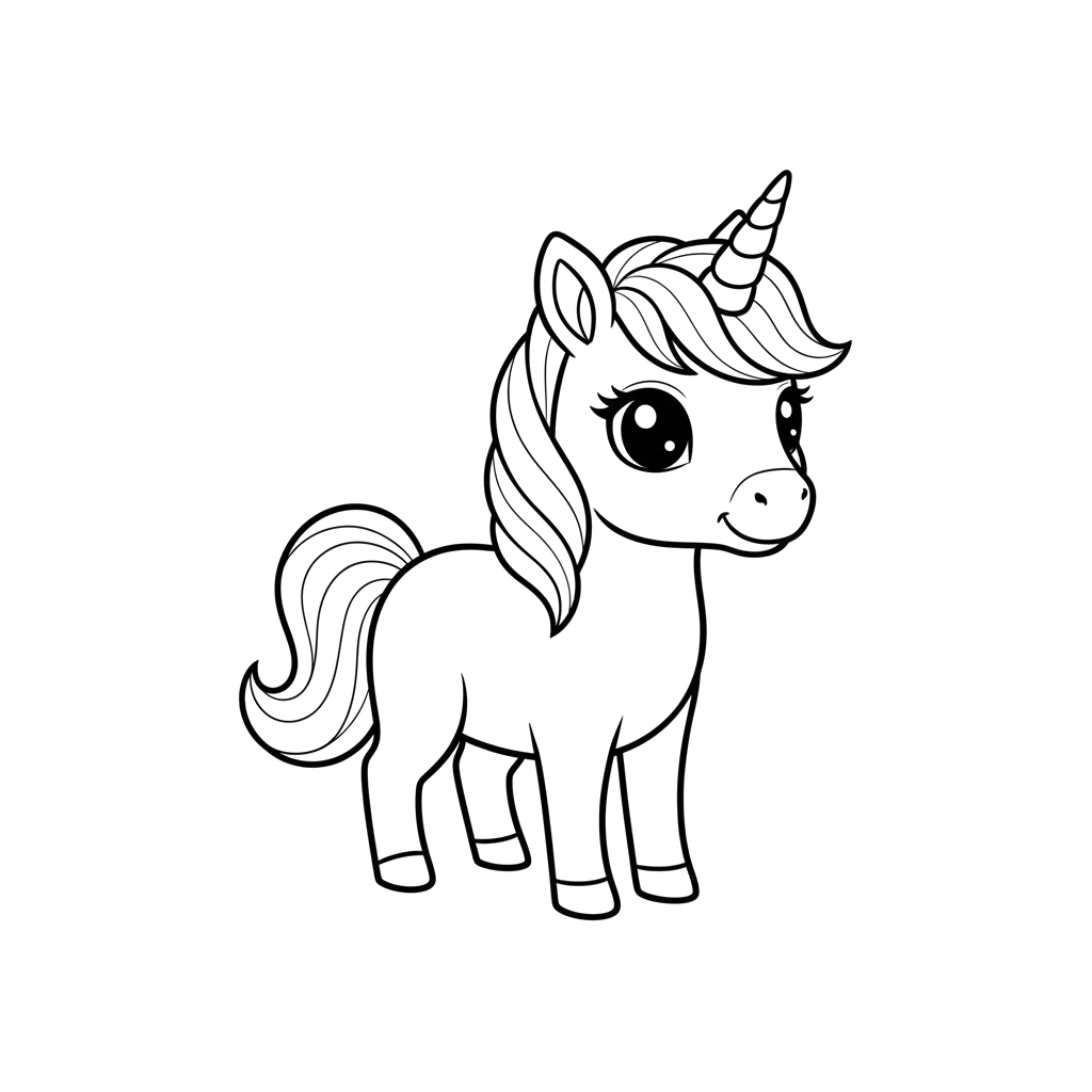 Această imagine prezintă un unicorn adorabil, stând cu ochi mari și prietenoși și un corn frumos dungat. Coama și coada sa fluturătoare sunt gata să prindă viață cu culori vibrante.
