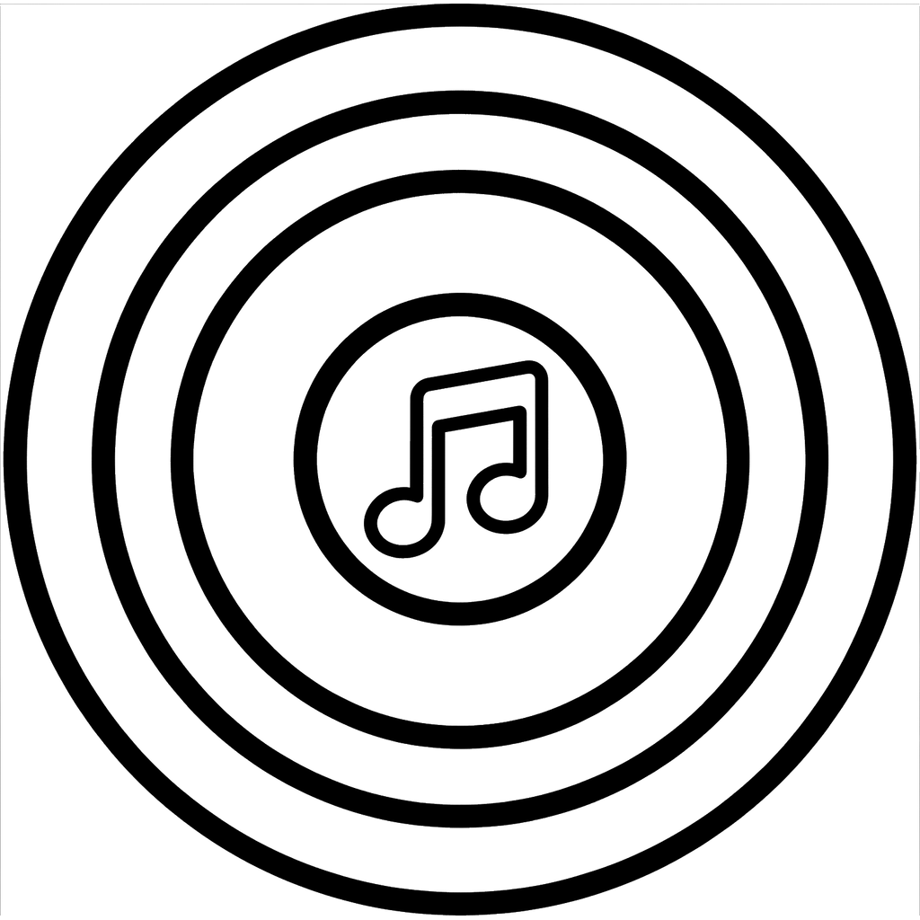 En not är centralt placerad inuti en serie av utstrålande koncentriska cirklar, vilket visuellt representerar ljudvågor eller en ljudutsändning. Denna enkla design fångar essensen av musik som delas eller överförs.