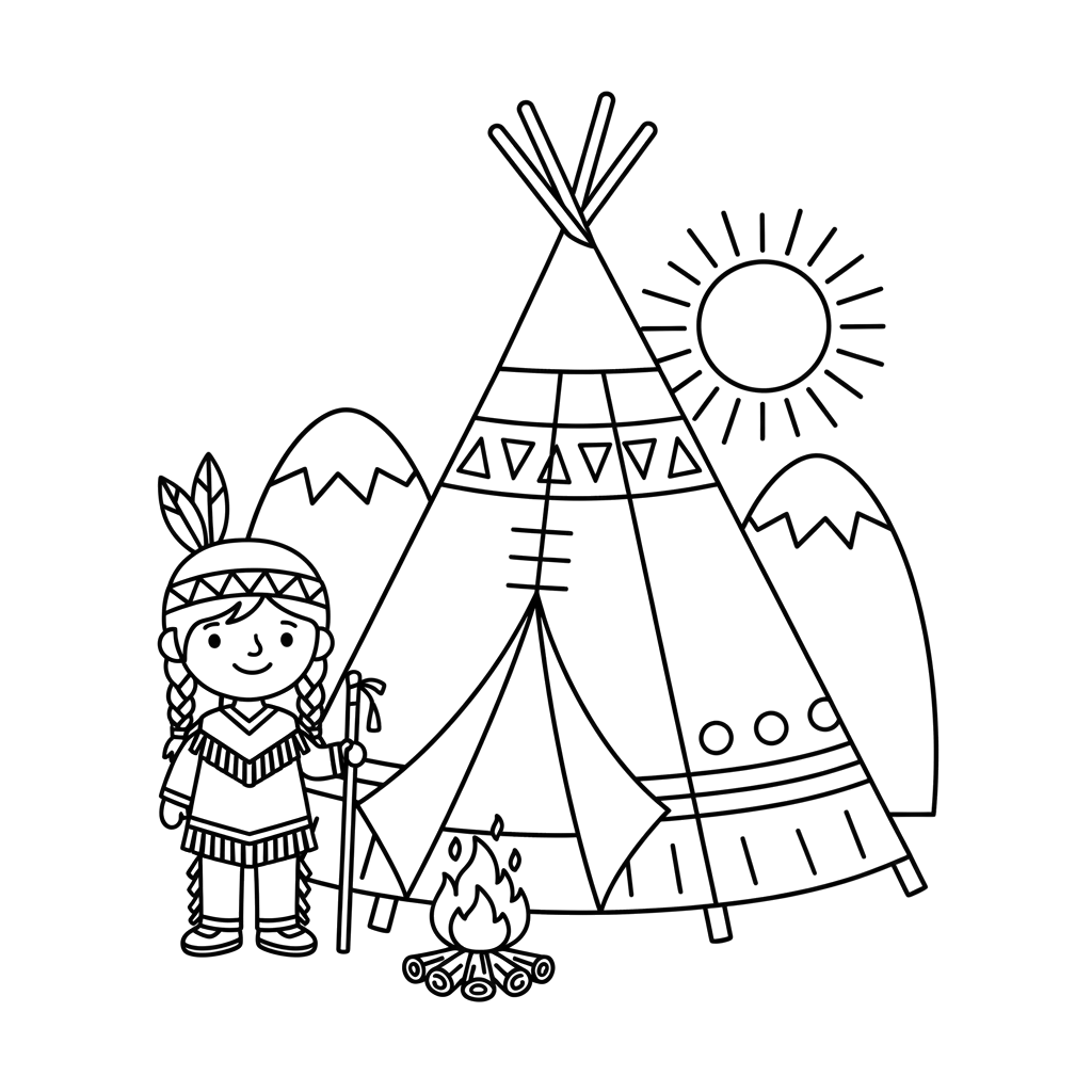 Ett glatt barn klätt i traditionella stamkläder står bredvid en dekorerad tipi, med berg, en skinande sol och en varm lägereld som fulländar denna livfulla utomhusscen.