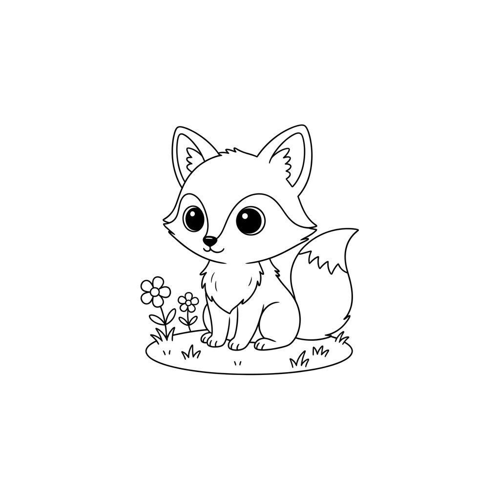 En charmig rävunge med stora, gnistrande ögon sitter lugnt i ett gräsfält, omgiven av fina blommor. Denna förtrollande scen är perfekt att väcka till liv med livfulla färger.