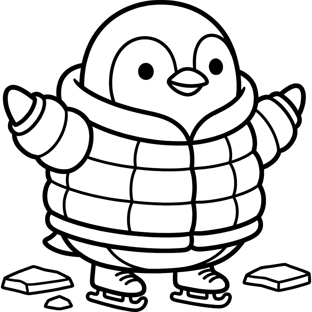 En glad pingvin är redo för en dag med vinterkul, påklädd en varm puffjacka och med skridskor på fötterna. Den står lyckligt på en isfläck med armarna utsträckta.