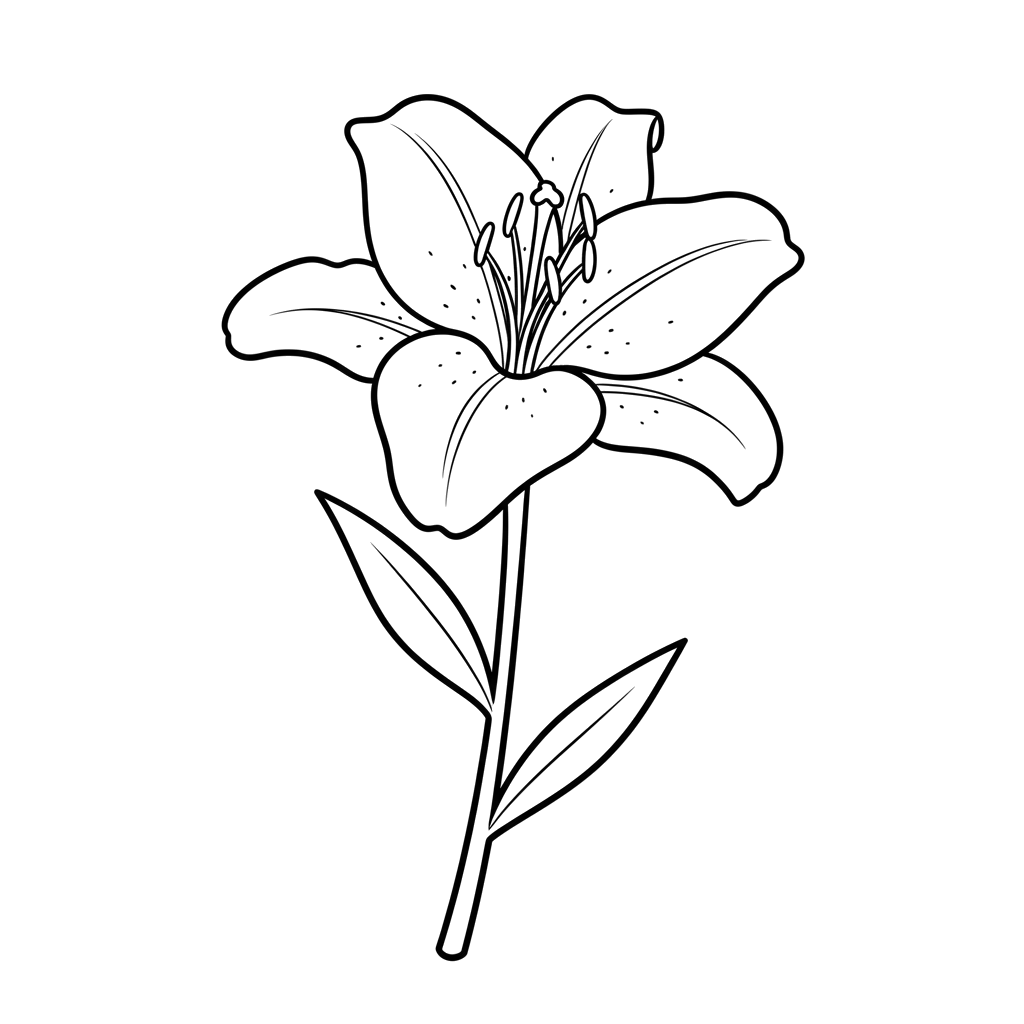 En vacker linjekonst föreställer en delikat liljablomma i full blom, redo för en touch av livfull färg. Denna eleganta blomdesign visar intrikata detaljer av dess kronblad, ståndare och slanka stjälk.