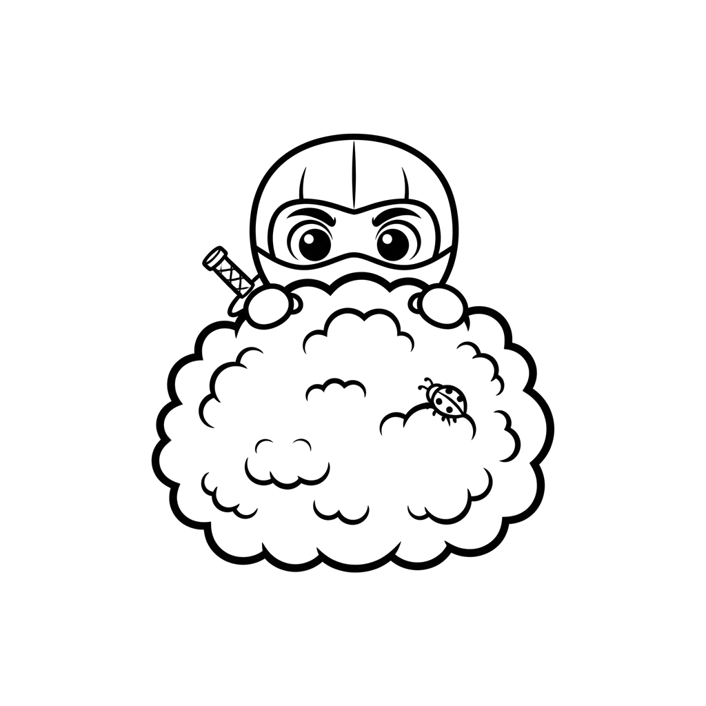 En charmig liten ninja kikar busigt fram bakom ett fluffigt moln eller en buske, med en liten nyckelpiga som sitter i närheten. Denna bedårande scen bjuder in till kreativitet för en rolig konstaktivitet.